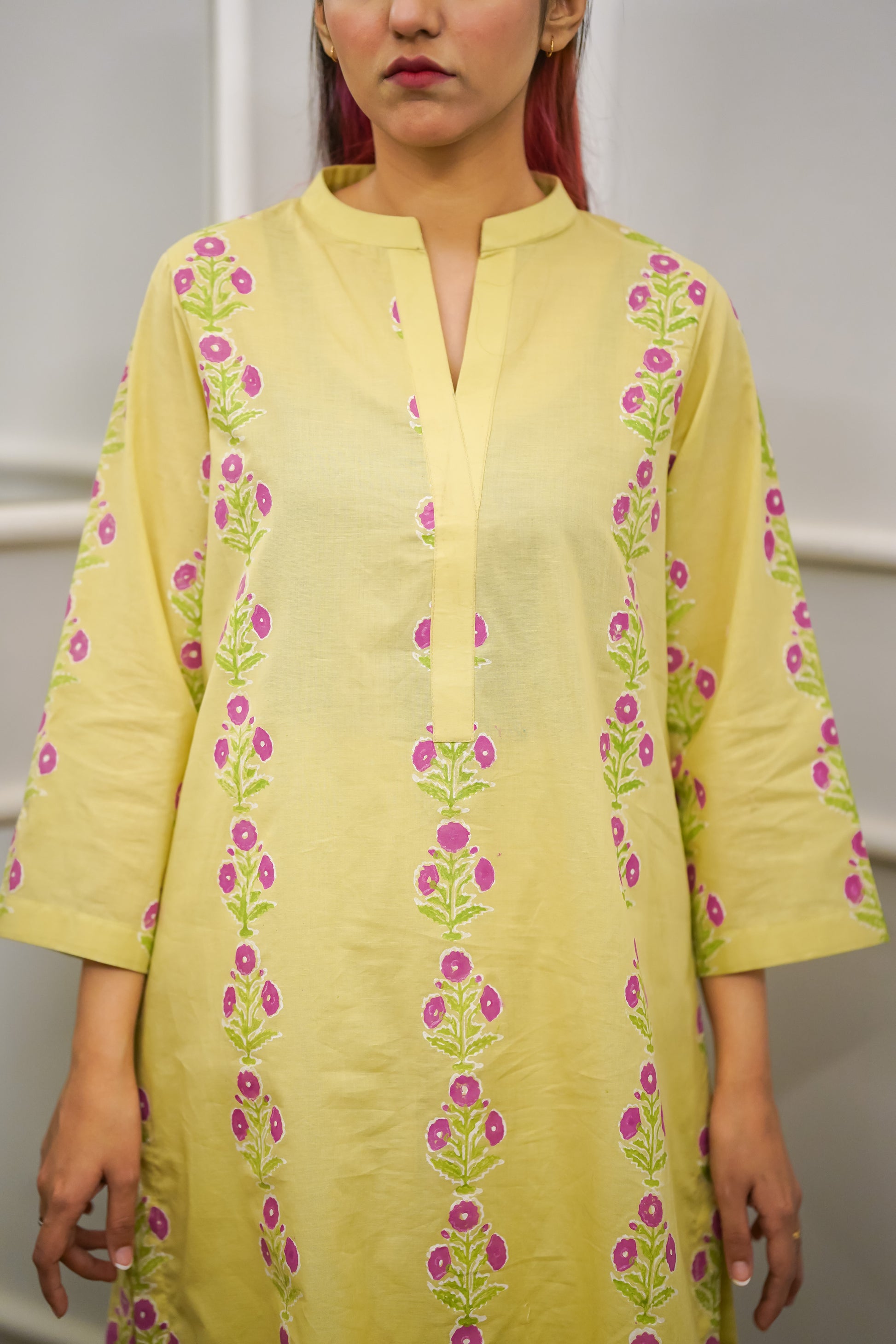 A fresh and cheerful lemon yellow lawn suit featuring all-over traditional block print floral stripes in vibrant magenta and green, designed to brighten every summer gathering and Eid celebration.