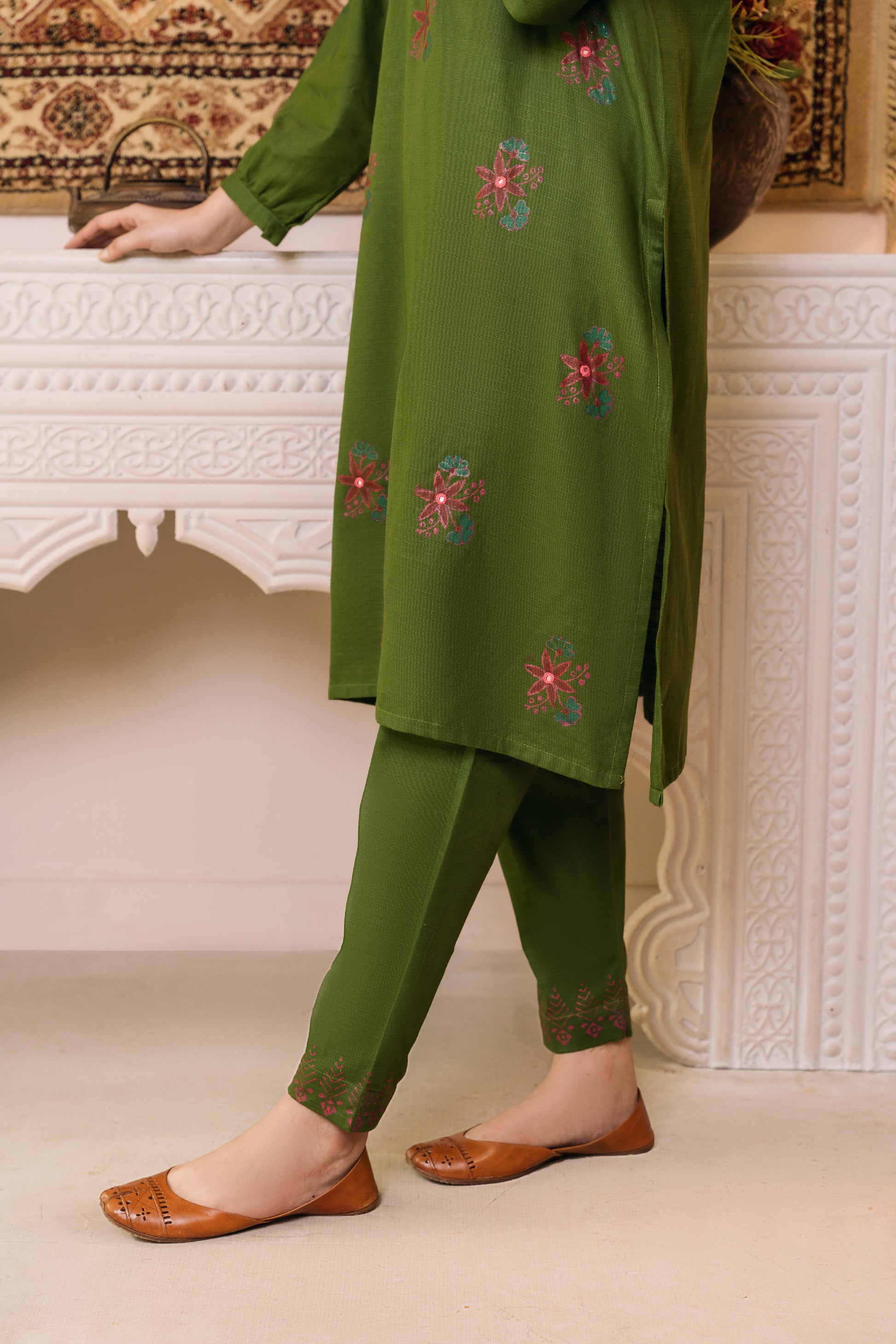 The Green Olive suit, a trendy and modern piece, is a 2-piece ready-to-wear ensemble in green olive. It is available in sizes small, medium, large, and extra-large