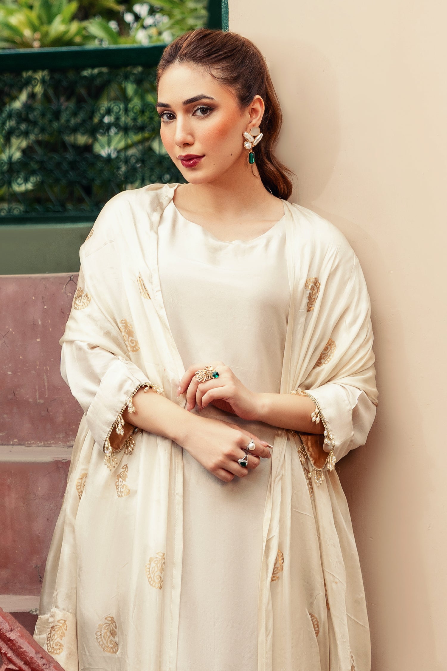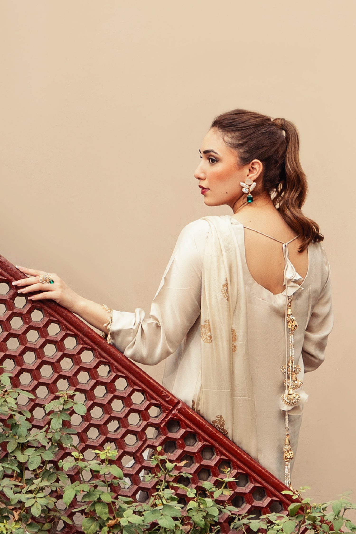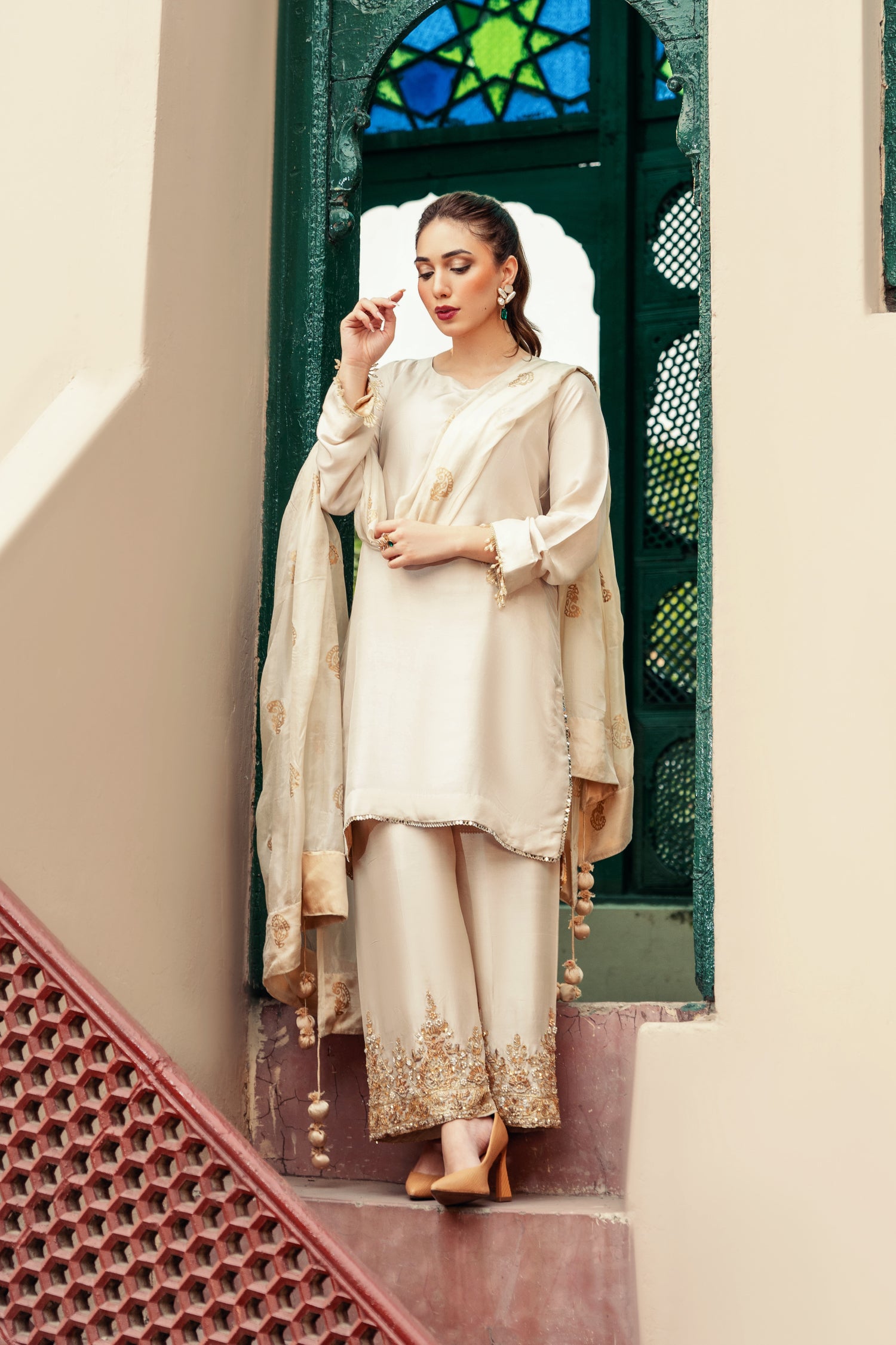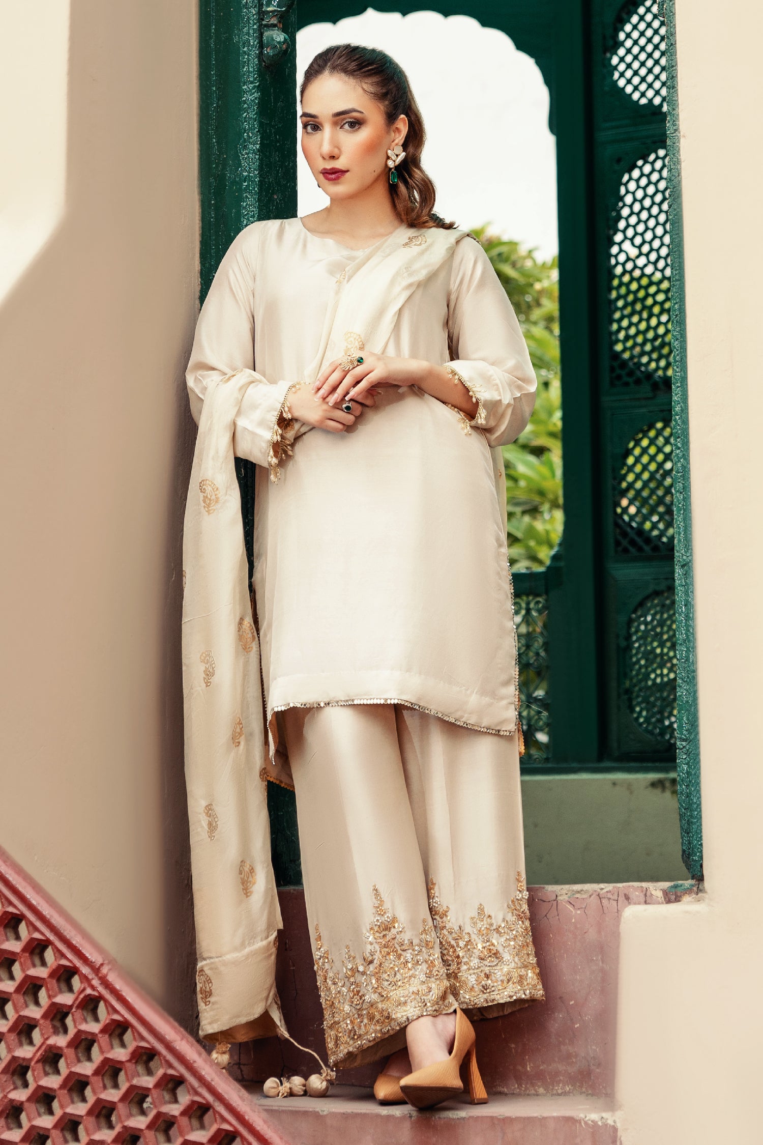 Indulge in the luxury of Janum. This unstitched Rose Gold Pure Raw Silk suit features embellished handwork and is perfect for special occasions.