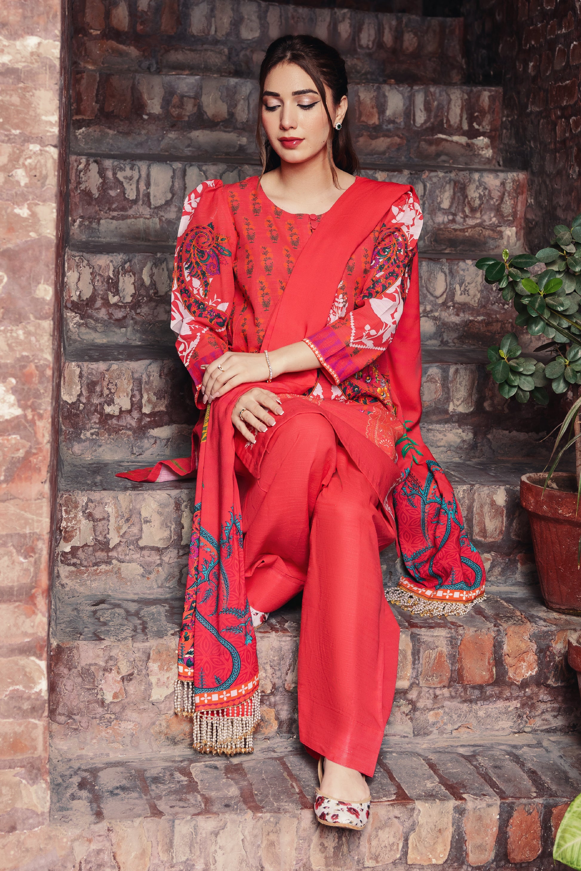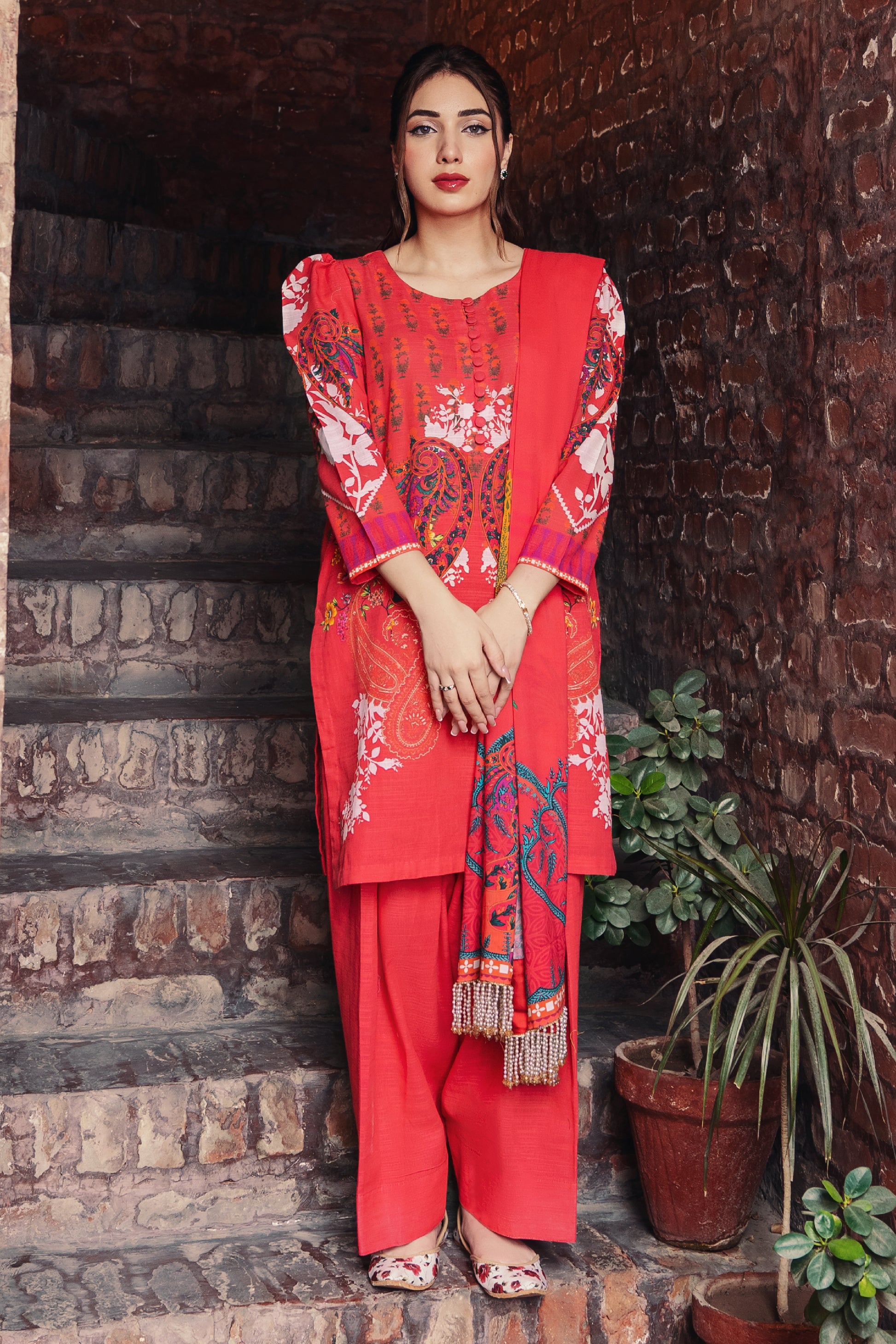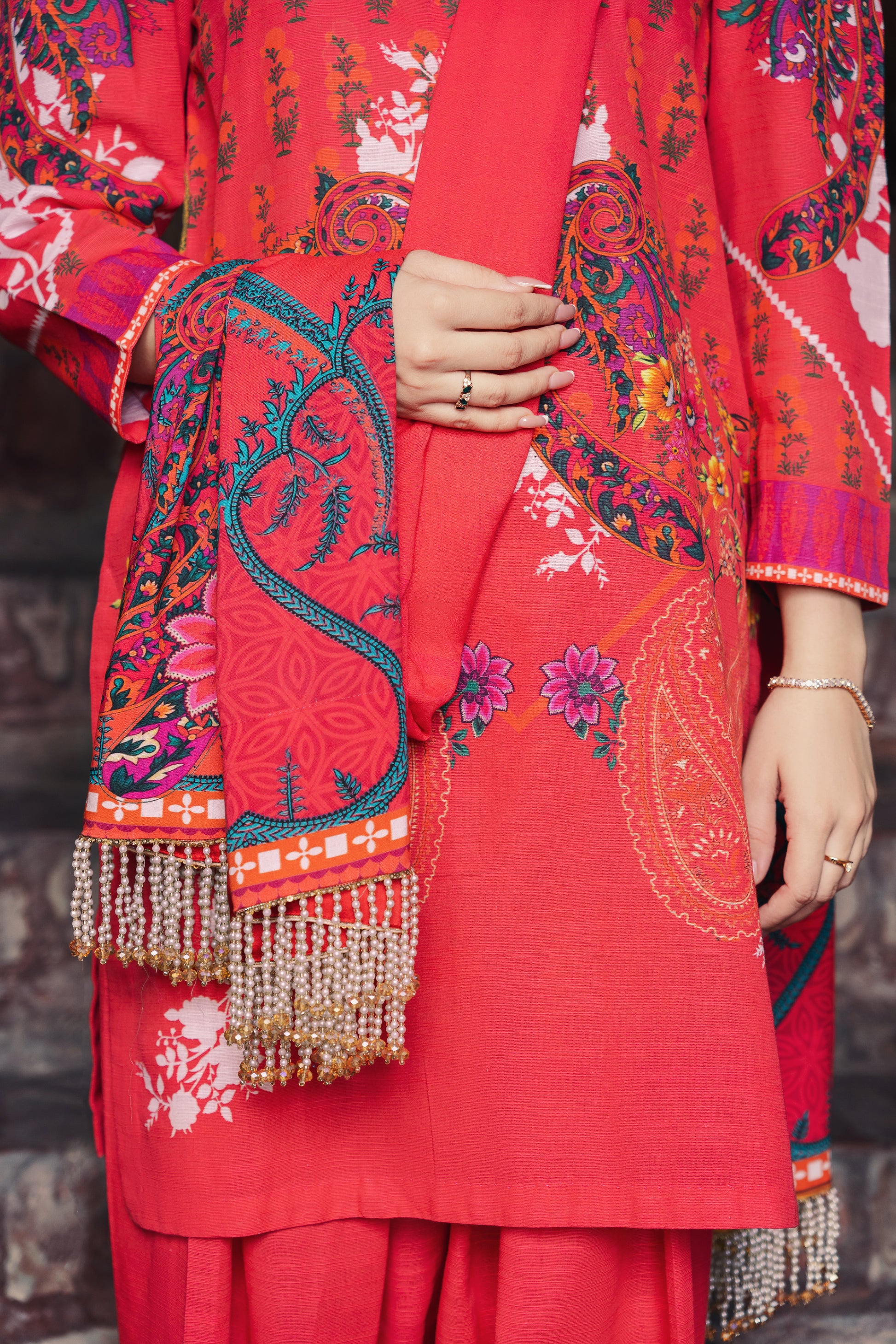 Experience the elegance of Laali. This three-piece unstitched Khadar suit includes a Viscos dupatta. The 2.85-meter shirt, 2.5-meter trouser, and 2.5-meter dupatta offer versatility for any occasion.