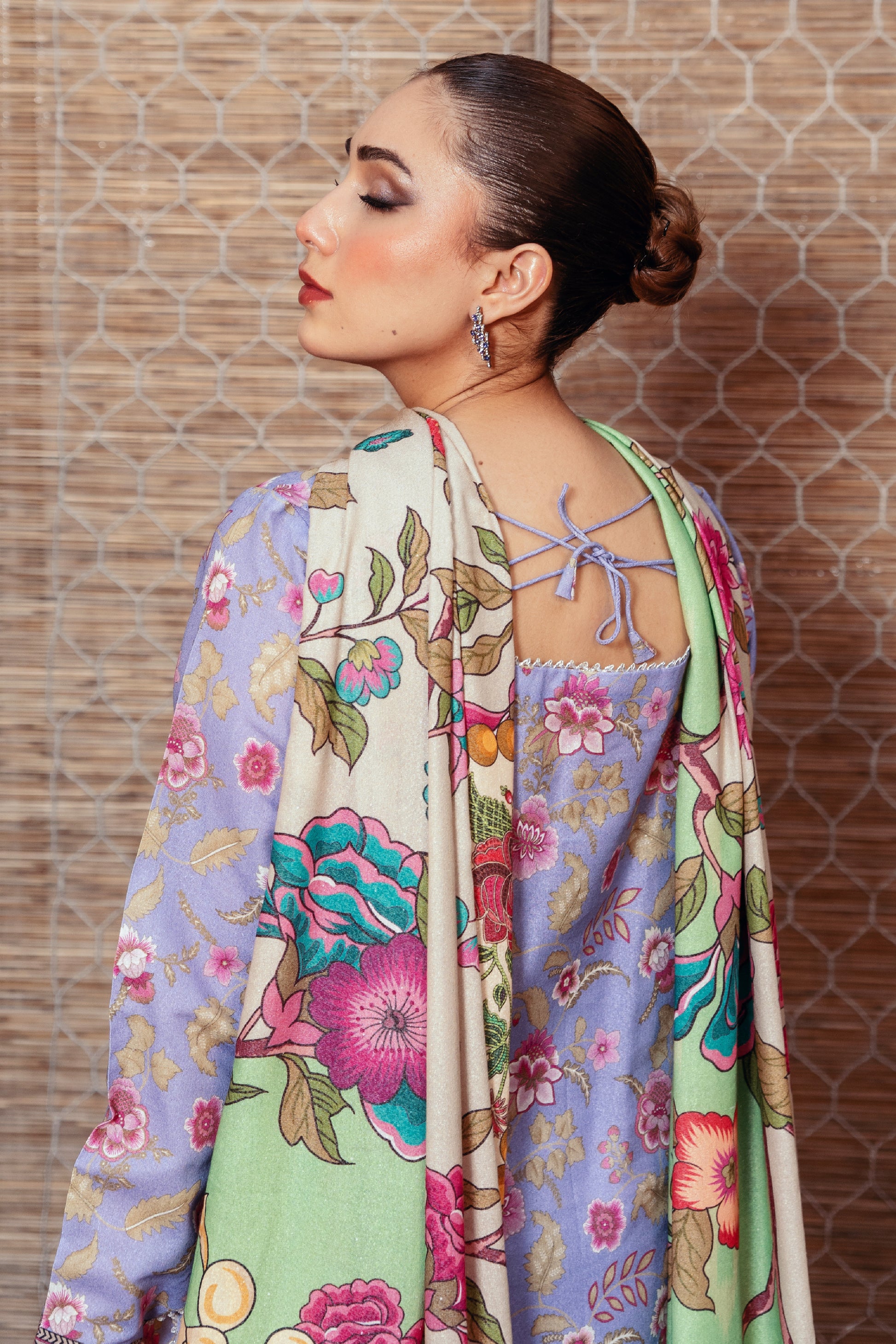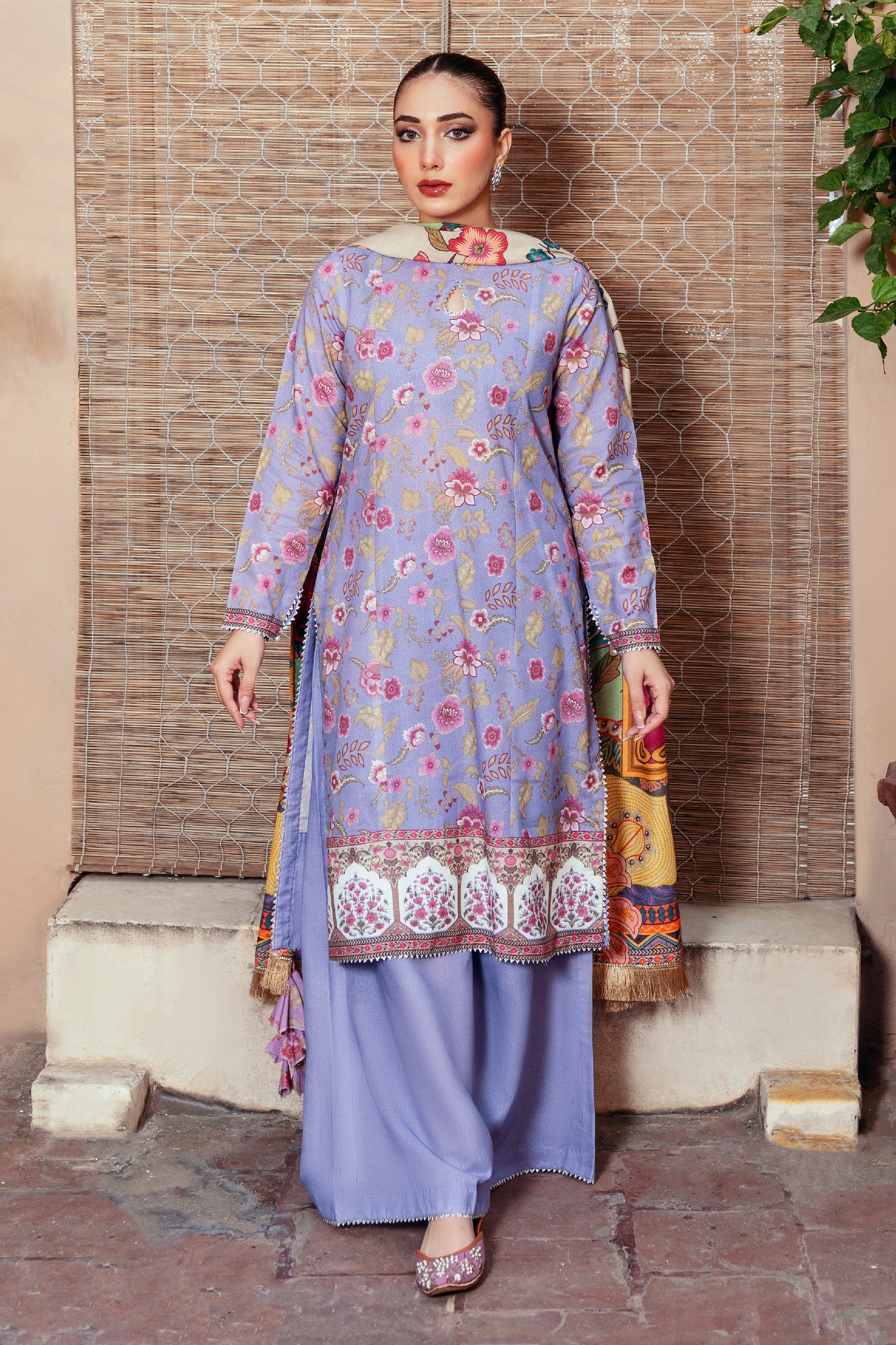 Experience the elegance of Laila. This three-piece unstitched Karandi suit includes a printed dupatta. The 2.85-meter shirt, 2.5-meter trouser, and 2.5-meter dupatta offer versatility for any occasion.